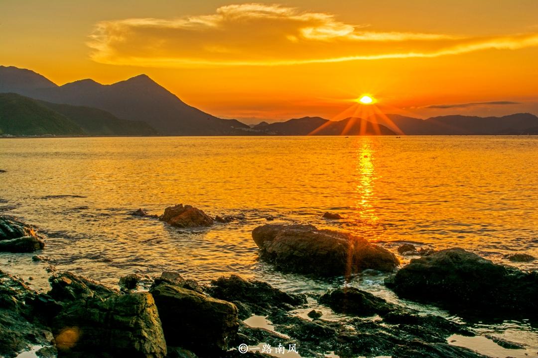 当太阳从山头慢慢滑落,最后隐入地平线之时,西边的天空变成橙黄色调,海水也仿佛染上橘子色,伫立在海边,看着眼前如此瑰丽的景色,忍不住用手机和相机记录下经典的瞬间。